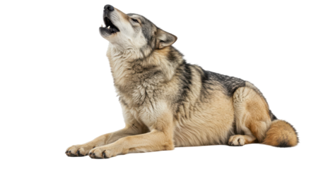 Close-up of a wolf howling with mouth open wide, displaying sharp teeth and detailed fur texture. Isolated on transparent background.