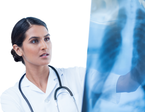 Smiling healthcare worker checking medical data on laptop, wearing professional attire, isolated
