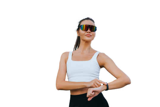 beautiful fit Asian woman in sunglasses, checks  pulse on fitness bracelet is standing  against transparent background  during break of running training.
