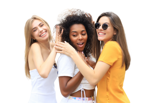 Three young smiling hipster women in summer clothes posing on a transparent background. Female showing positive face emotions. Dancing.