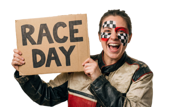 Excited woman with race day face paint holding "RACE DAY" sign on transparent background