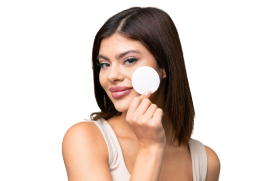 Caucasian woman cleansing face on transparent background