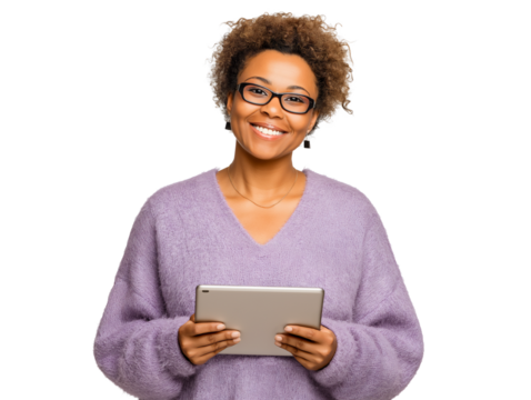 Young african american woman with curly black hair and glasses wearing a purple sweater, holding and using a tablet computer, smiling and looking at the camera, isolated on transparent background