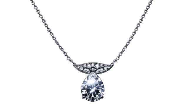 A close-up studio shot presents an elegant necklace with a pear-shaped diamond pendant. The silver chain hangs delicately. The pendant captures light