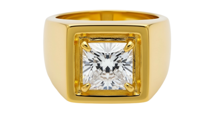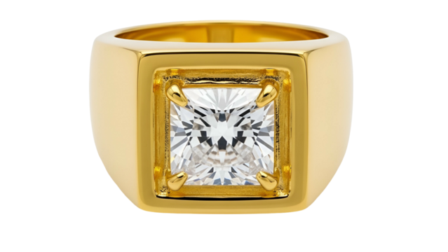 Four opulent diamond and gemstone rings (pink, purple) with yellow precious metal bands on a reflective white surface, transparent background, macro shot, high-end luxury jewelry display