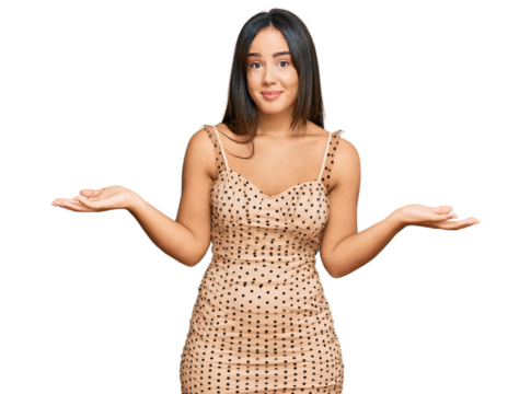 Young beautiful hispanic girl wearing sexy party dress clueless and confused expression with arms and hands raised. doubt concept.