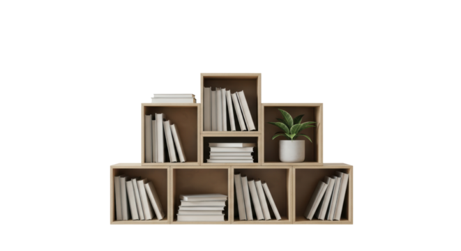 Isolated shelf unit with potted plant and books, minimalist wooden furniture item for home decor