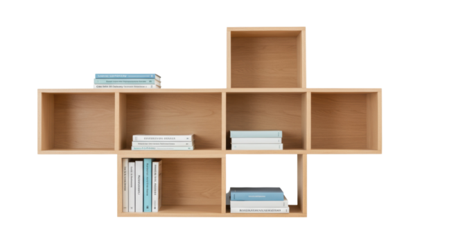 Modern light wood cube shelving unit isolated, contemporary bookcase with books for home decor and interior design projects