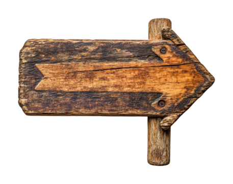 Rustic wooden arrow sign pointing right isolated on transparent background