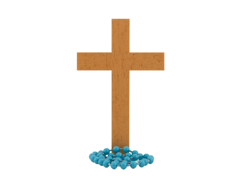 Wooden rosary beads with a crucifix on display isolated on transparent background