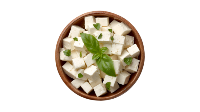 Feta cheese cubes in wooden bowl with basil