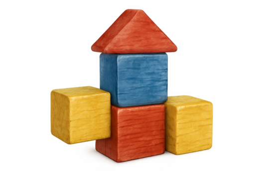 Colorful wooden toy building blocks forming house structure representing childhood play and development on transparent background