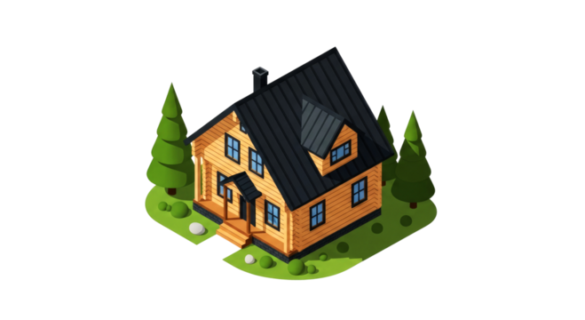secluded mountain cabin isometric 3d model of rustic wooden house, isolated on transparent background