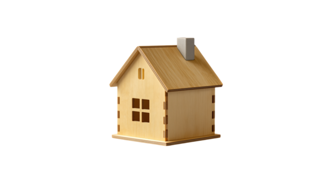 Wooden house building model transparent background construction project minimalist design studio environment close-up view