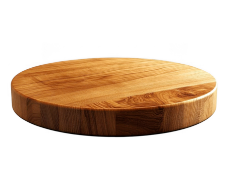 A circular light-brown wood platform, slightly angled, stands against a deep-black background
