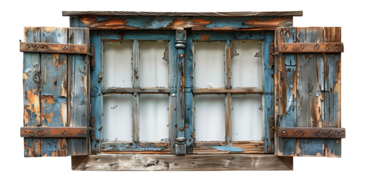 weathered wooden window with peeling blue paint and rusted hinges, showing patches of bare wood. Old wooden window