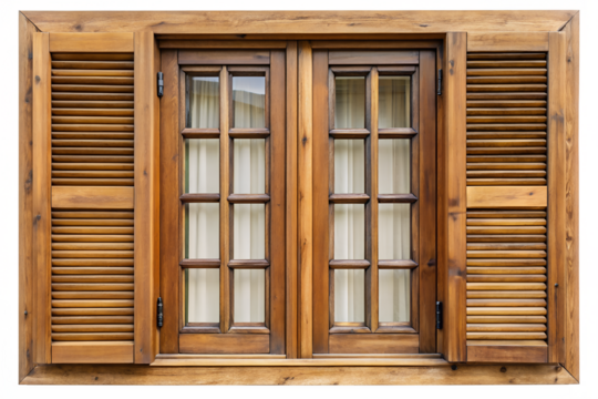 Classic wooden window, featuring open shutters, rich grain patterns cut out transparent isolated on white background PNG