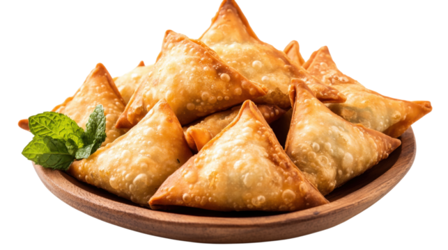 Golden samosas appetizer fried pastry indian snack wooden dish mint