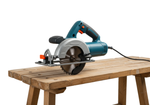 Powerful circular saw in use on wooden workbench diy project workshop environment. Cut out png