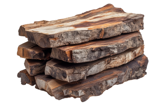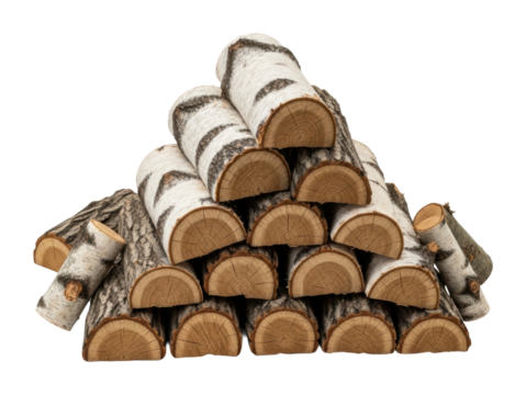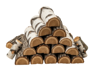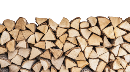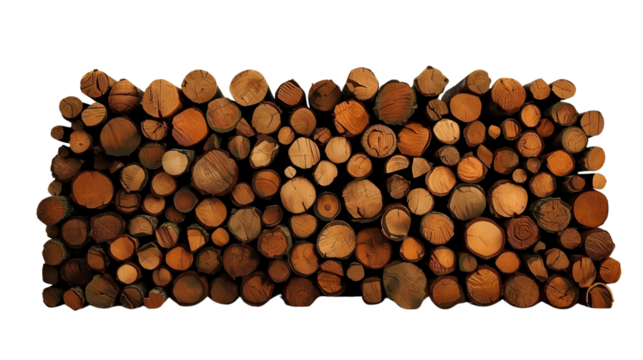 Firewood logs stacked woodpile for winter fuel wood burning season isolated on transparent background