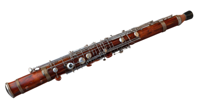 Wooden Oboe Woodwind Musical Instrument with Silver Keys and Transparent Background for Musical Performance and Fine Arts
