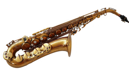 Ornate wooden clarinet with gold keys isolated on transparent background