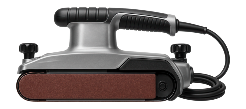 Belt sander with an elongated abrasive belt for carpentry workshops.