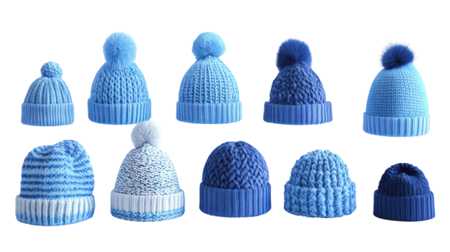 Three blue knitted winter hats isolated on a transparent background 1