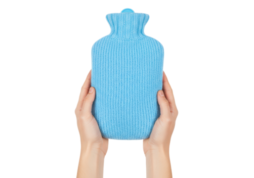 Isolated hot water bottle held by hands, covered with blue knitted woollen fabric cover