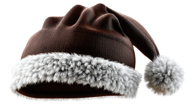 Cozy Winter Hat: A warm and inviting brown winter hat, adorned with a fluffy white trim and a playful pom-pom, perfectly captures the essence of cold-weather comfort.