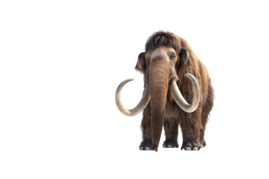 A realistic depiction of a woolly mammoth, isolated on a white background, showcasing its impressive tusks and thick, shaggy coat.