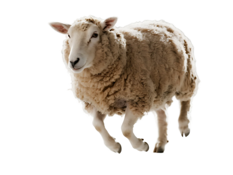 A fluffy sheep with white wool is depicted standing on a plain background, showcasing its thick and woolly coat.
