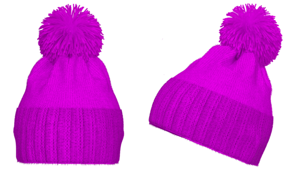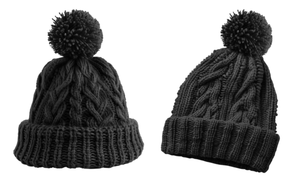 Set of black pom pom ball knit knitted woven cuffed wool ribbed beanie hat, front and flat lay view on transparent cutout PNG file. Mockup template for artwork design