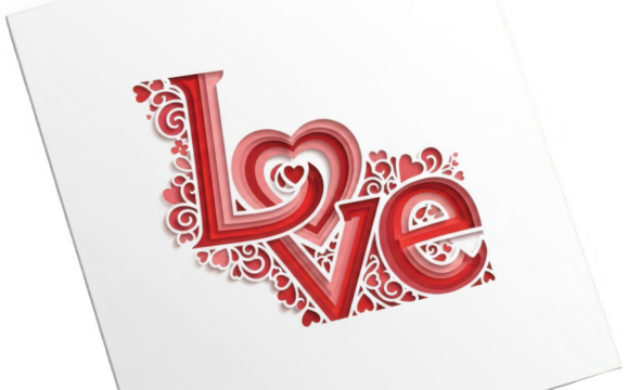 Valentine Creative paper cut love word art with layered red and pink hearts and floral swirls