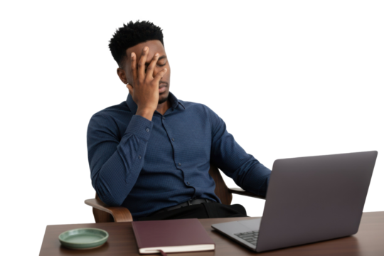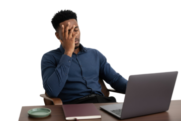 Stressed man in checkered shirt using laptop isolated on transparent background