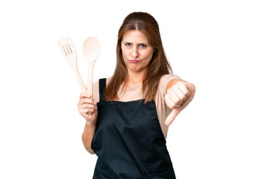 Middle age caucasian woman holding a rolling pin over isolated background showing thumb down with negative expression