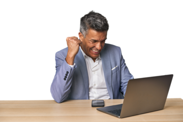 Celebratory middle-aged Hispanic man with laptop on phone call