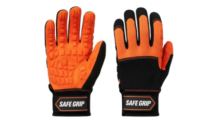 High visibility orange and black safe grip work gloves for protection and grip on transparent background