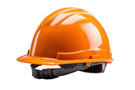Bright orange safety hard hat with black adjustable strap on black background helmet, Png, Isolated on Transparent Background, Cut Out