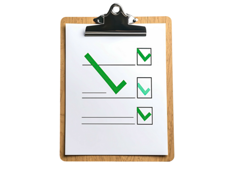 A wooden clipboard holds a checklist with green check marks