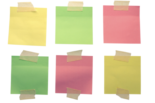 Colorful sticky notes attached with adhesive tape on transparent background. Isolated