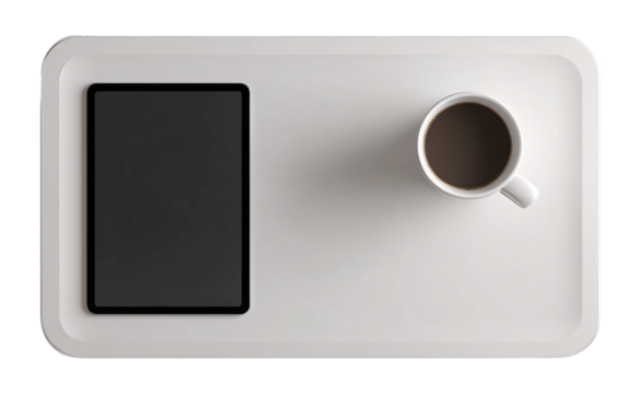Modern small study desk featuring tablet and coffee mug for creative work and efficient focus isolated on transparent background PNG
