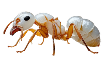 Closeup macro photograph of a single red ant isolated on transparent background, showcasing intricate details of its segmented body, antennae, and legs, highlighting its exoskeleton and compound eyes