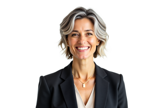 Smiling businesswoman portrait on white. Gray hair, blazer, necklace. Professional headshot for corporate profile, website. Isolated on transparent background.
