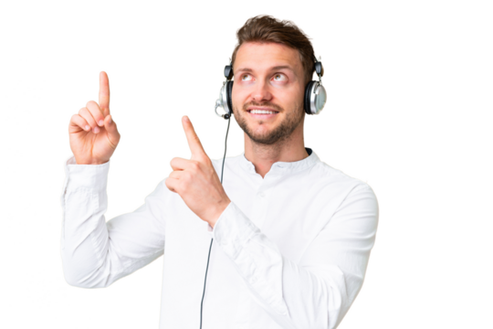Telemarketer caucasian man working with a headset over isolated chroma key background pointing with the index finger a great idea