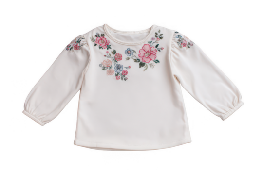 Cute children's long-sleeved top with an embroidered floral pattern on a white background, png, transparent