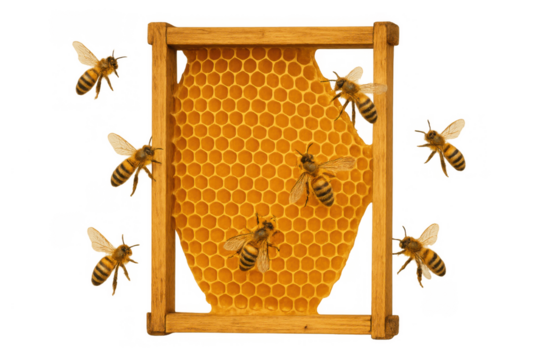 Honey bees flying around honeycomb frame, working to produce natural golden honey for beekeeping