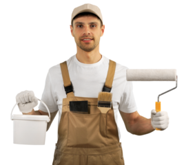 Smiling  construction worker wearing a yellow reflective jacket and hard hat, isolated on transparent background
