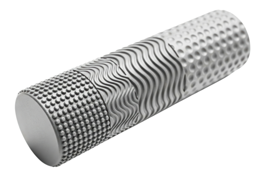 Gray cylindrical roller with wavy and bumpy textured surface patterns isolated with transparent background