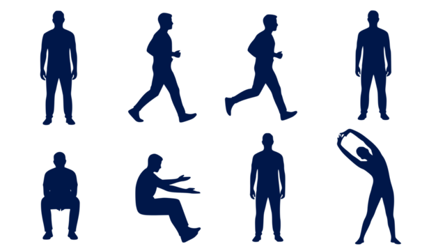 Set of nine blue silhouette people in various poses and movements